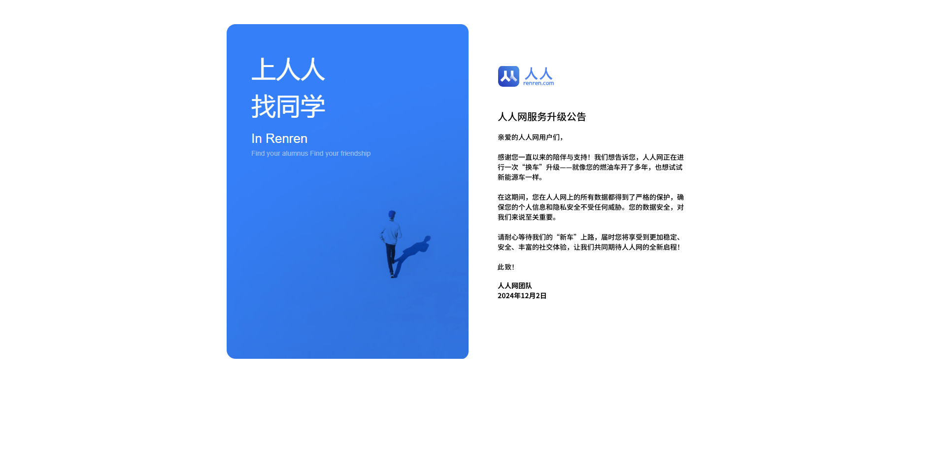 請耐心等待我們的“新車”上路,屆時您將享受到更加穩(wěn)定安全、豐富的社交體驗,讓我們共同期待人人網(wǎng)的全新啟程!